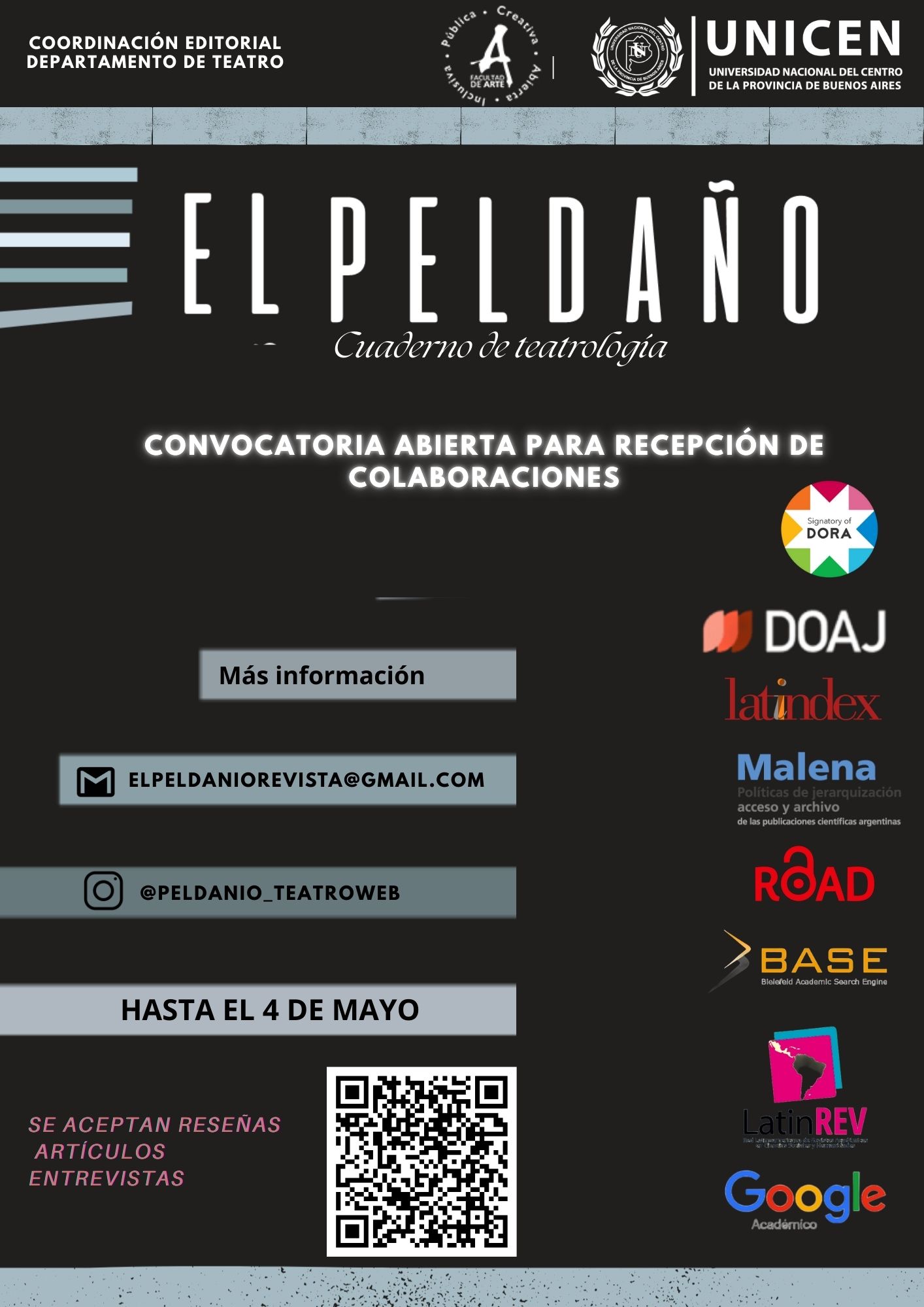 Se encuentra abierta la recepción de artículos, reseñas, entrevistas para nuestro espacio de publicación El peldaño: cuaderno de Teatrología. ES UN ESPACIO DE PUBLICACIÓN GRATUITO. Es una revista de Acceso Abierto gestionada por integrantes docentes del Departamento de Teatro de la Facultad de Arte de la Universidad Nacional del Centro de la Provincia de Buenos Aires, con sede en la ciudad de Tandil, Provincia de Buenos Aires- Argentina. Una publicación académica con el objetivo de difundir reflexiones acerca de la teoría y la práctica del hecho teatral. Edición: Departamento de Teatro de la Facultad de Arte. UNICEN. Periodicidad: semestral. Dos números al año ENERO Y JULIO. (períodos enero-julio/julio-diciembre). La convocatoria para formar parte del N°26 cierra el 4 de mayo de 2026 pero queda abierta y permanente la recepción de trabajos que en caso de ingresar después de esa fecha serán considerados para el número siguiente. Agradecemos su participación y/o difusión.